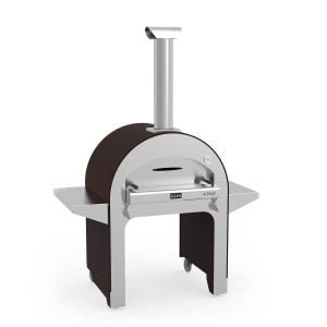 - Wood-fired garden pizza oven with stainless-steel dome that allows the oven to reach high temperatures by burning less firewood.