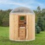 This unique Outdoor Barrel Washroom with an acrylic roof measures 7′ diameter and 106″ total height. The kit is manufactured with knotty western red cedar walls and floor and is easy to assemble in 4 hours or less. Customize this unit with our optional interior walls, 2 drawer vanity, wall mount mirror, Shower fixtures and other options. We do not provide electrical or plumbing in the washrooms, this is up to the customer to add as they feel is required in their situation.
