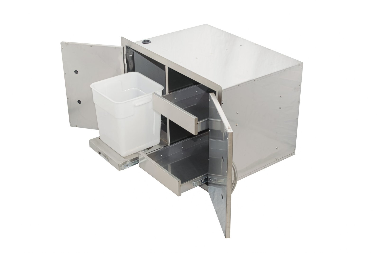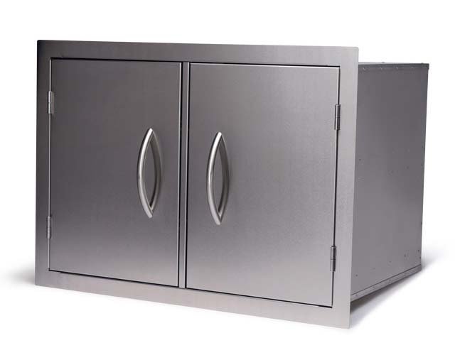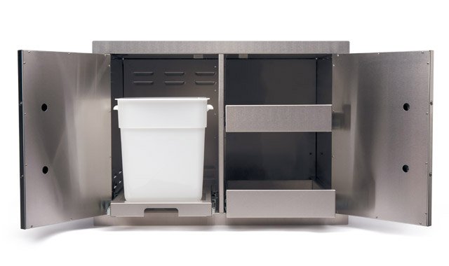 The Jackson Grills Combo Door/Drawer opens to reveal slide-out drawers and a slide-out for propane tank or trash bin. This unit is fully enclosed and provides a significant amount of storage space.