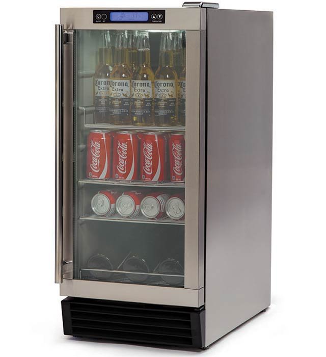 This stunning stainless steel outdoor beverage center will impress with its glass door and display shelves.