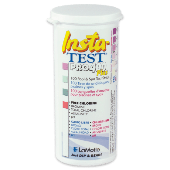 Designed specifically for on-site use by service pros, each vial contains 100 strips. Packed in 12-packs or 100-packs and offered by distributors in a la carte volumes. Insta-TEST® PRO 400 Plus measures Free Chlorine 0 to 10 ppm, Bromine 0 to 20 ppm, Total Chlorine 0 to 10 ppm, Alkalinity 0 to 240 ppm and pH 6.2 to 9.0 with instant results. The instructions are in English, Spanish, and French