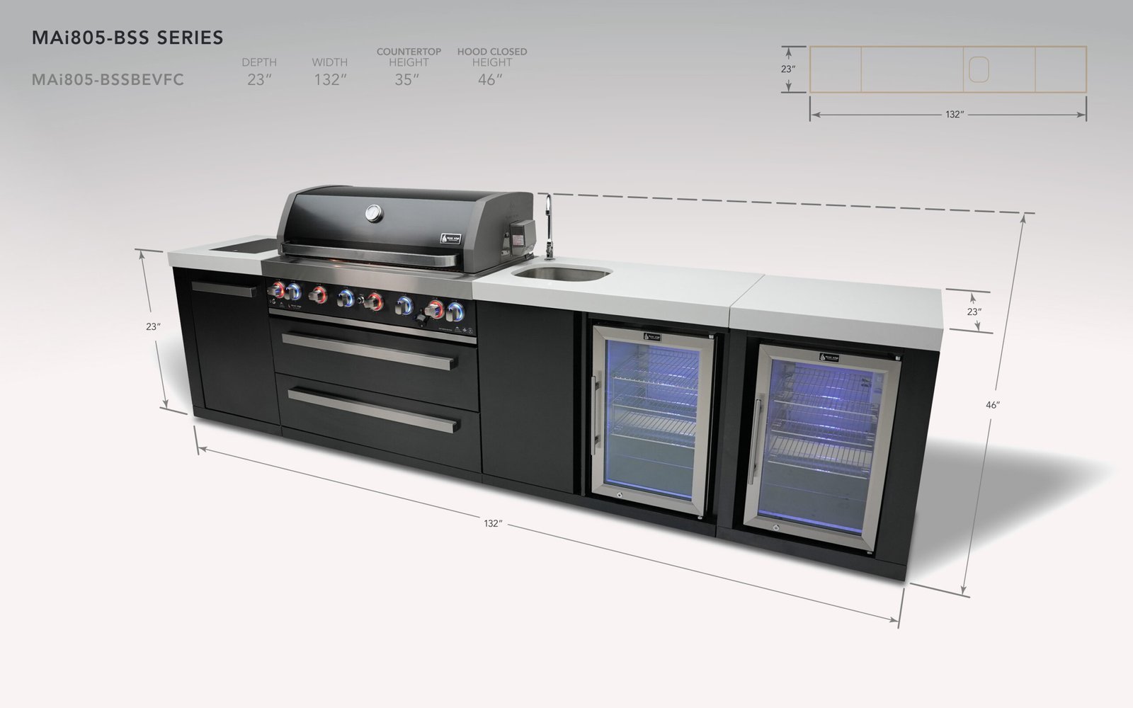 The Mont Alpi Black series combines the longevity of stainless steel with the beauty of black. This grill combines six burners of standard cooking size along with an extremely useful infrared side burner suitable for searing, pan frying and boiling and an infrared rear burner for the ultimate rotisserie experience. The beverage center and fridge module adds two beautiful outdoor rated refrigerator and a well-appointed prep area with sink and faucet.