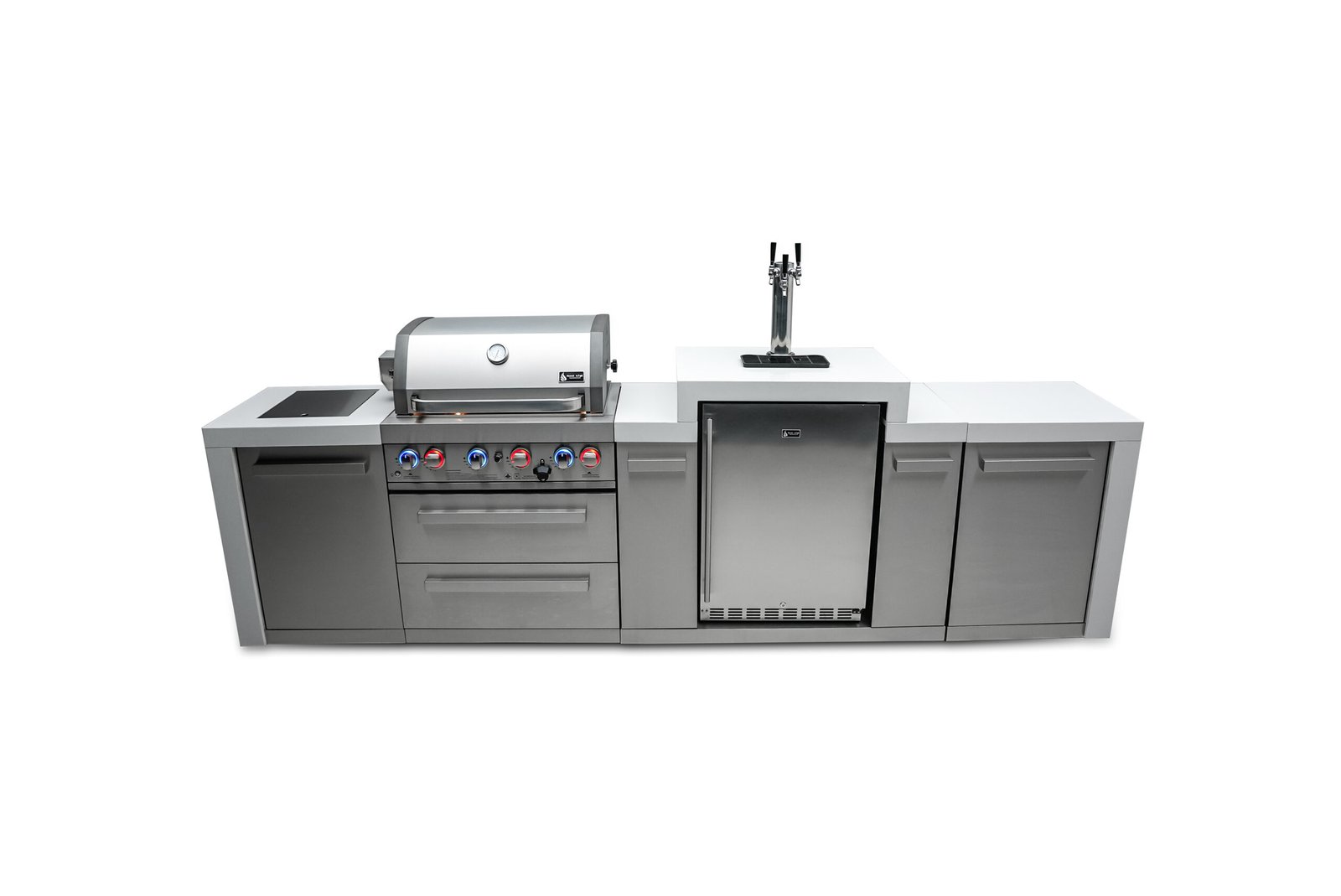 The Mont Alpi D series stands for deluxe and that is exactly what you get from the MAI400-DKEG. This grill combines four burners of standard cooking size along with an extremely useful infrared side burner suitable for searing, pan frying and boiling and an infrared rear burner for the ultimate rotisserie experience. The 3 pour kegerator with granite top and drip tray is perfect for 3 barrels of beer (or other) and is cooled in an outdoor rated fridge for that perfect ice cold pint.