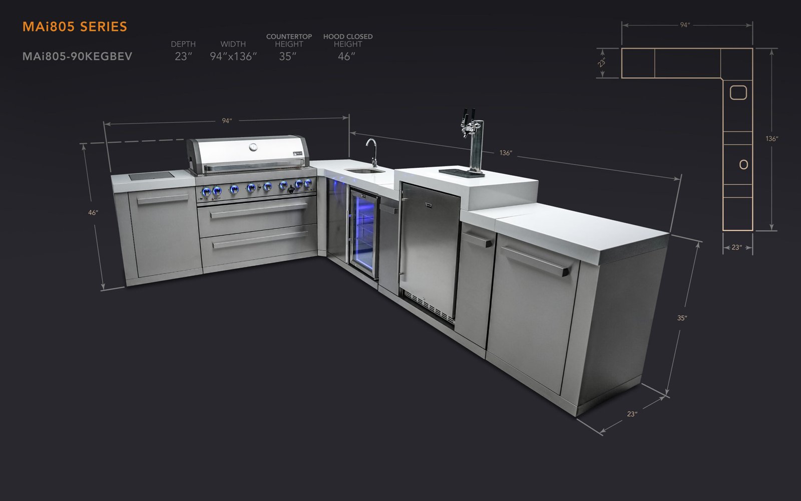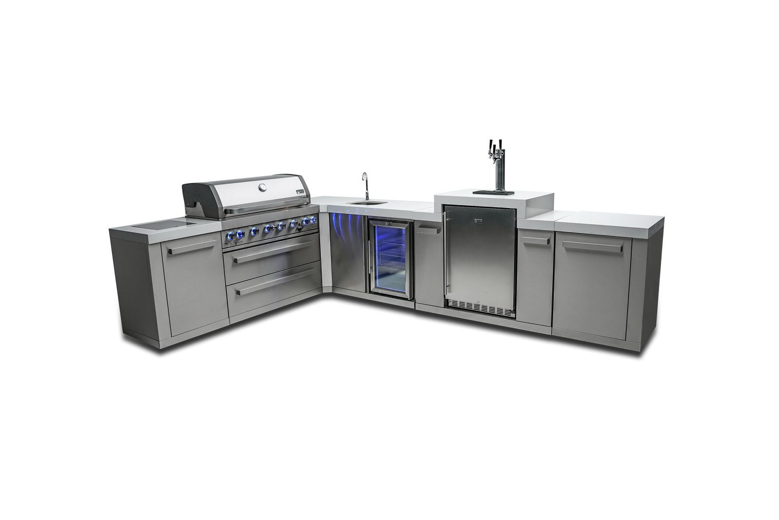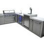 The Mont Alpi original series is tried and tested, strong and stunning. This grill combines six burners of standard cooking size along with an extremely useful infrared side burner suitable for searing, pan frying and boiling and an infrared rear burner for the ultimate rotisserie experience. The grill comes standard with LED knob lights that are blue when off and red when on and bright internal cooking lights for perfect vision and precision control. The 90 degree module includes a 3 barrel kegerator, outdoor refrigerator and sink and faucet.