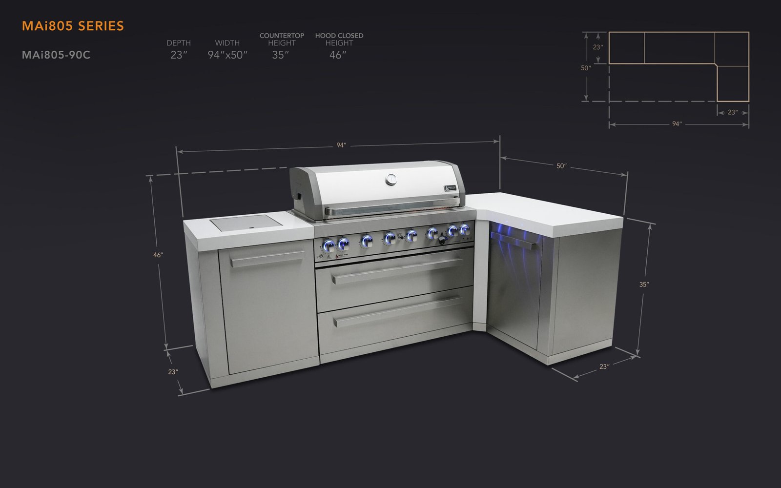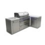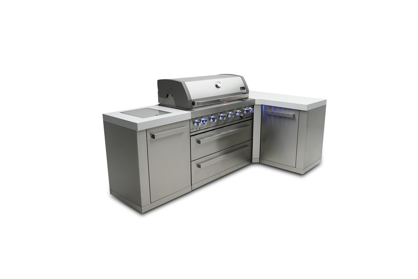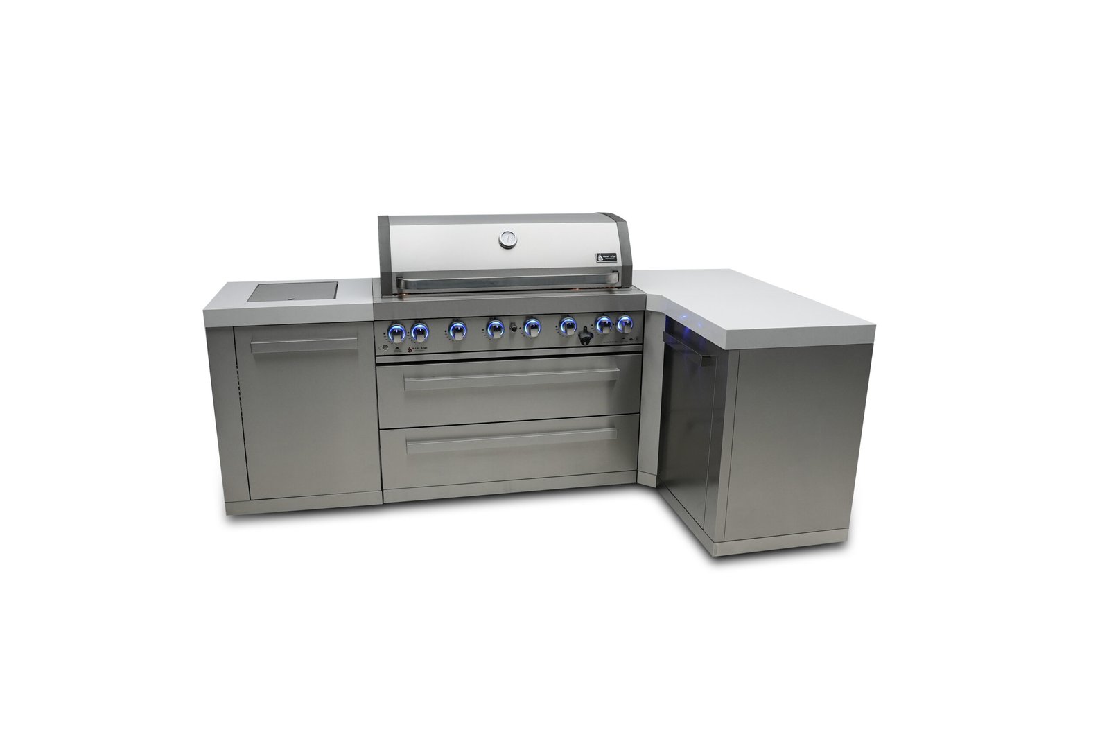 The Mont Alpi original series is tried and tested, strong and stunning. This grill combines six burners of standard cooking size along with an extremely useful infrared side burner suitable for searing, pan frying and boiling and an infrared rear burner for the ultimate rotisserie experience. The grill comes standard with LED knob lights that are blue when off and red when on and bright internal cooking lights for perfect vision and precision control. The 90 degree module creates extra prep area and a great right angle for good use of corner space.