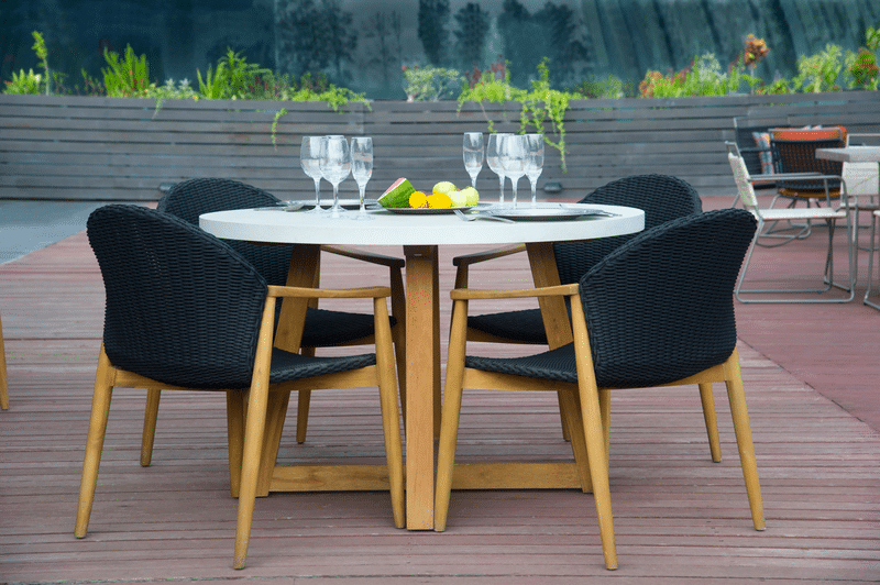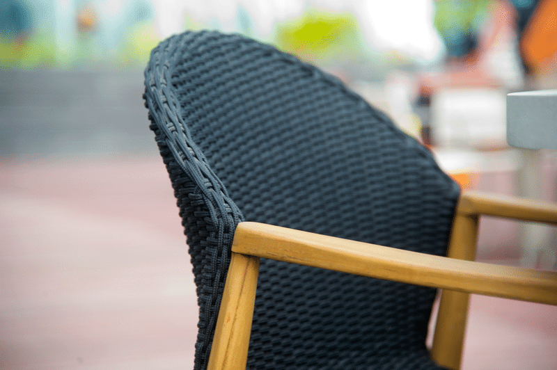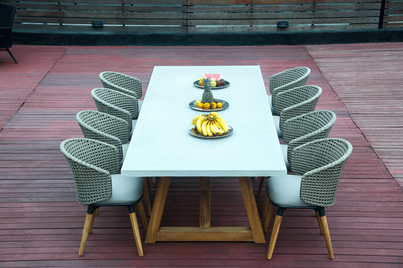 The Mika Collection is a stunning combination of teak wood and a modern rope weave. Posted price includes the Large Dining Table and 6 Dining Arm Chairs.