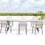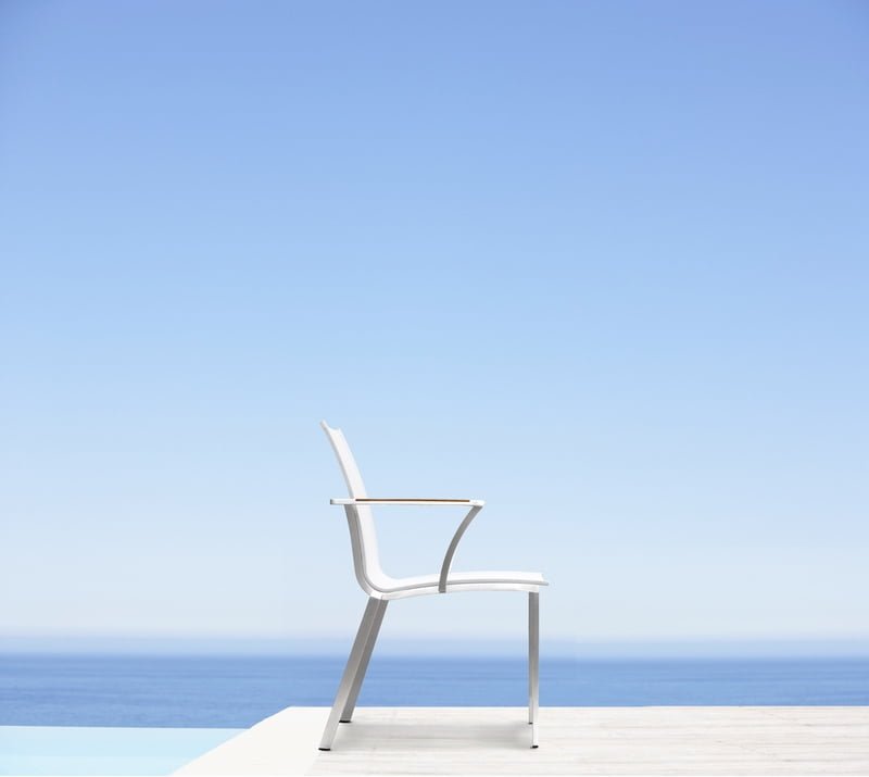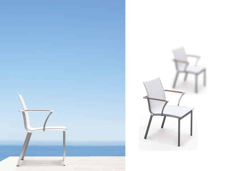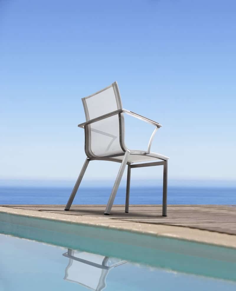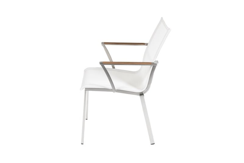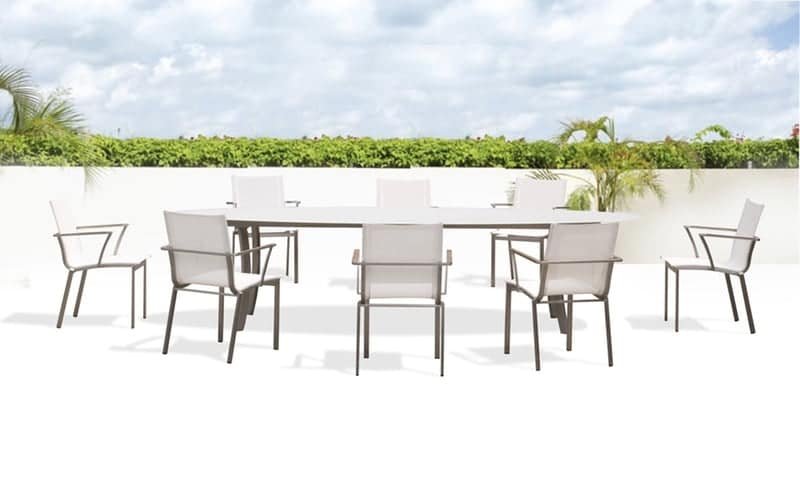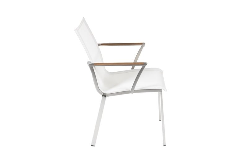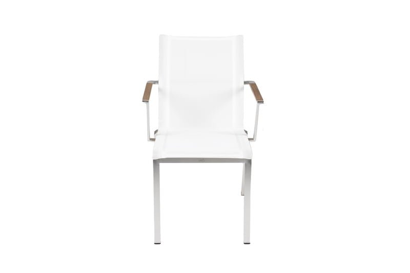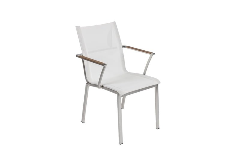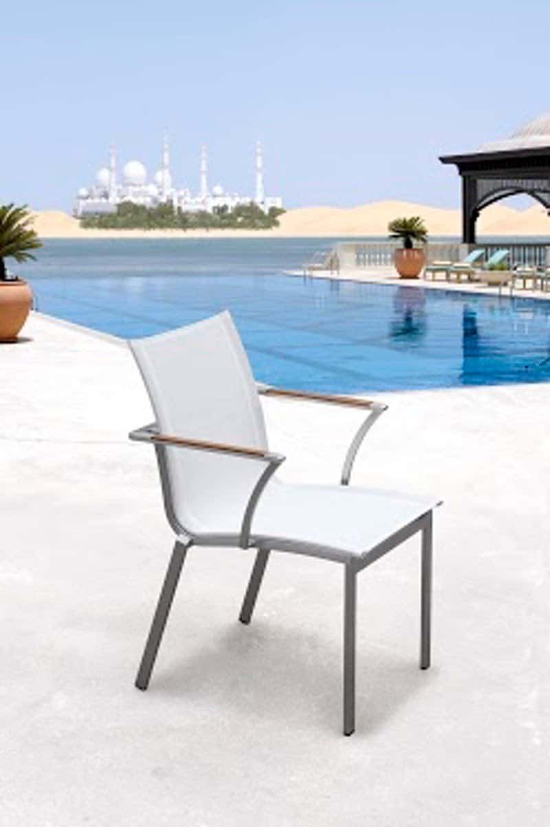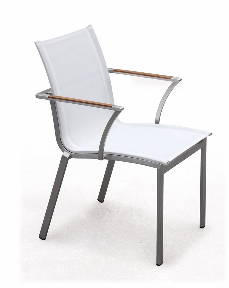 The beautiful Tiffany dining set is designed to last, with 304 stainless steel, and black or white 8mm frosted glass. The Batyline sling is also available in black or white, completely changing the look of this gorgeous set. Chairs included a beautiful teak arm insert, providing just the right amount of warmth to offset this contemporary collection.