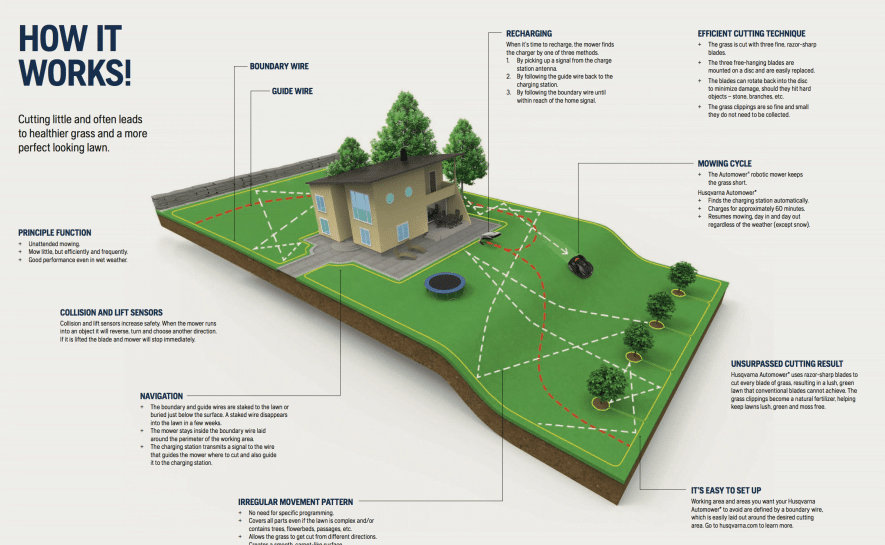 Meet Automower® 450XH, a robotic mower that will give you the perfect lawn and more free time. If you own a medium or large-sized yard up to 1.25 acres, Automower® 450XH is the model of choice. Cuts up to 3.5″. Featuring smart technology and an intuitive interface, Automower® is the world’s most capable robotic mower.