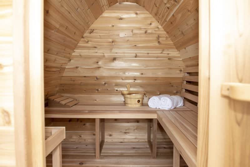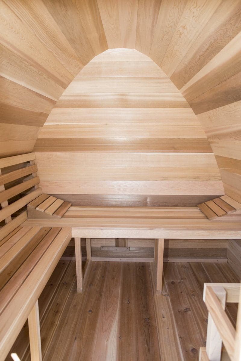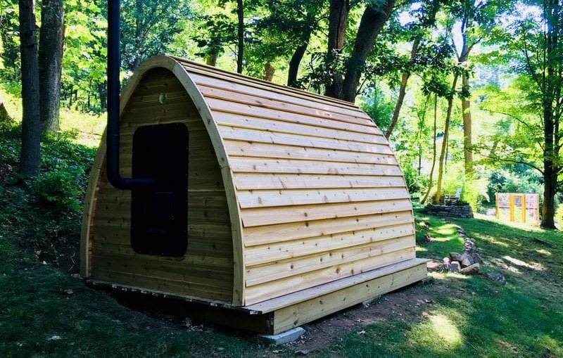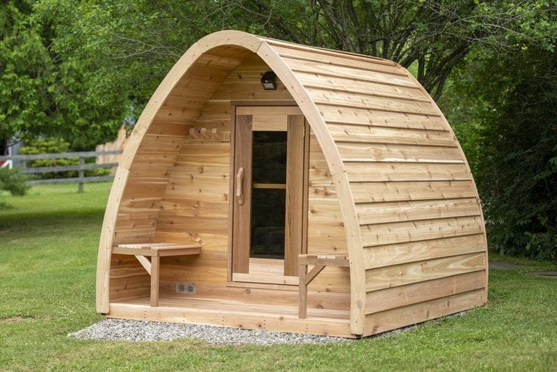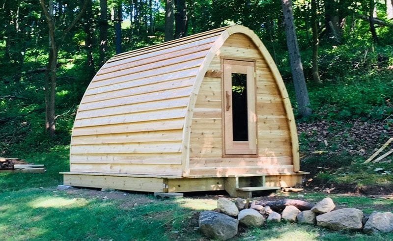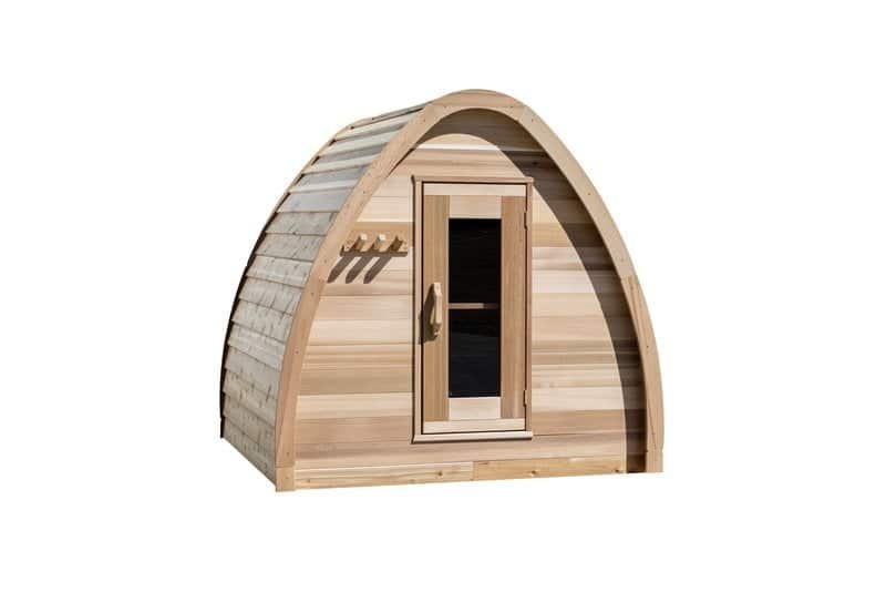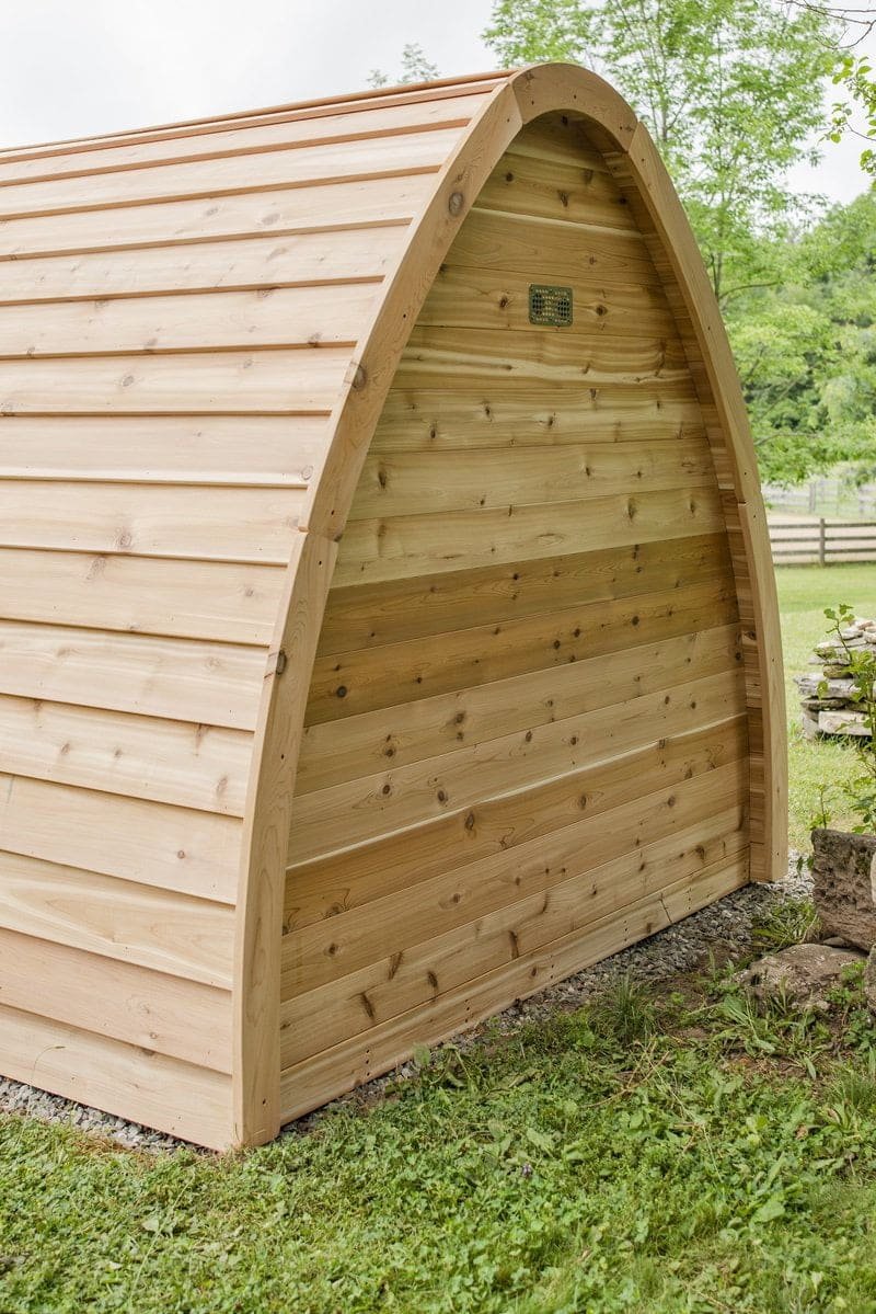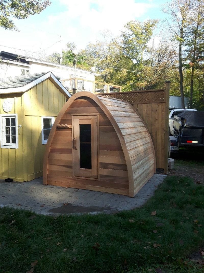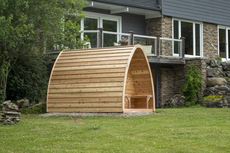 The whymiscal design of the Mini Pod is reminicent of a fairytale, and will add a fun focal point to any Canadian backyard. 7′ wide and 7′ long the mini pod is ideal for upto 4 people, include is a 6KW electric heater, but this can be changed to wood curing if you desire. The mini has a number of options that extend its length including a 2′ overhang or a 4′ change room. The mini also offers front and rear window options.