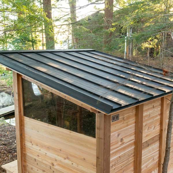The Backyard Canada Dundalk Leisurecraft Pure Cube Mountain View Outdoor Sauna is one of the newest additions to the lineup, and it’s specifically designed to be built in rugged graded terrain. The Pure Cube Mountain View Sauna is a solid wood timber frame structure that ships to you in an pre cut and easy to assemble kit. Completely manufactured with Western Red Cedar the mortise and tenon timber frame kit can be installed anywhere because of the unique corner post base design. The Black Metal Standing Seam roof is made with 26 gauge steel and has a 20 year warranty. Optional Bronze Tinted or Mirrorpane Glass Windows and Doors, optional bench layout on the inside and many different heater options make this sauna a desired model for any home or cottage.