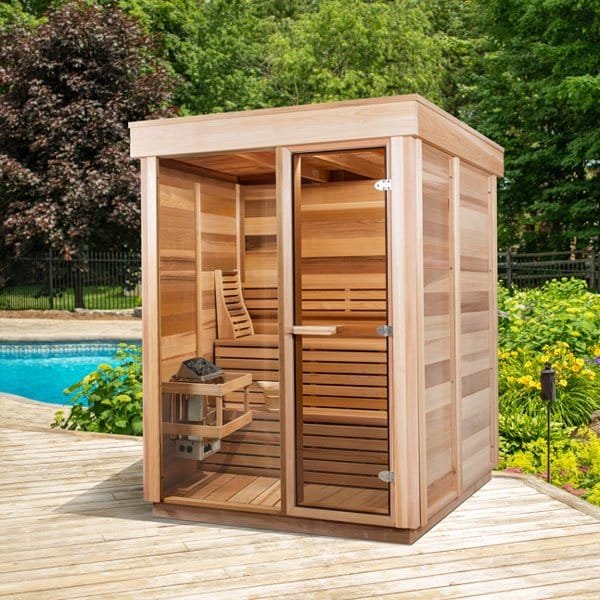 The Pure Cube CU550 Outdoor Sauna by Leisurecraft brings a luxurious new class of modular pre-built sauna kits to your home or cottage. Embrace the outdoors with the large double pane tempered glass front window and full glass door. Pamper yourself and your family or friends with this authentic modern Pure Cube Sauna kit. Made in Canada for Canada, you will love this sauna. Contact us for custom pricing and to discuss options, such as the location and type of glass, the placement of your door, and the type of heater that’s best for you.