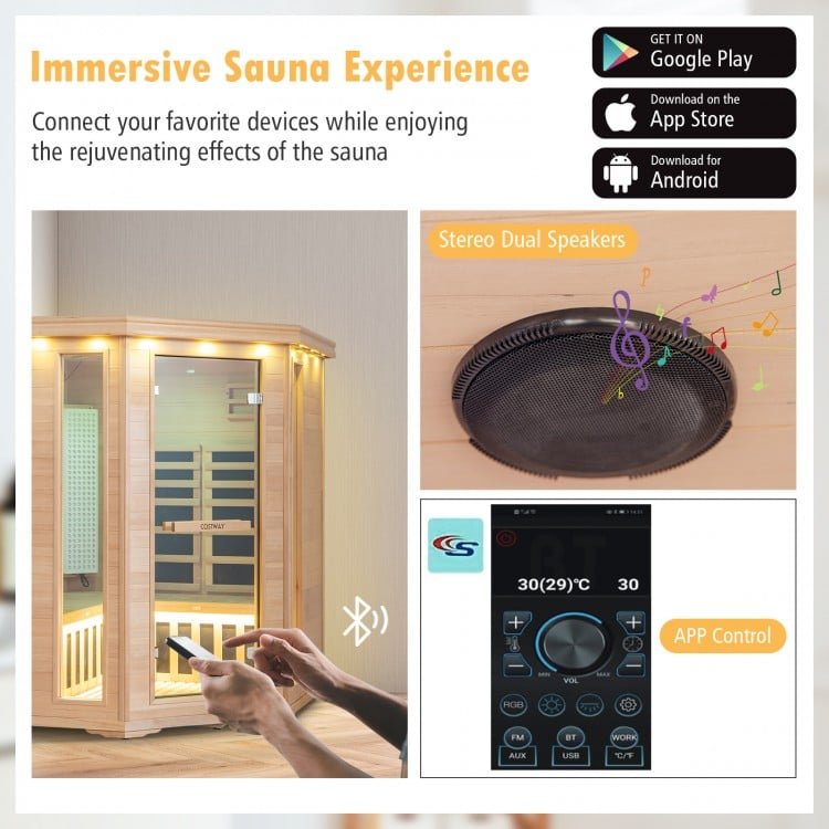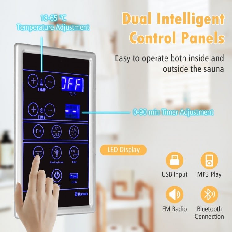 ● Dual Panel Operation and APP Control: The wooden sauna room is equipped with dual intelligent control panels, bringing convenience for operation both inside and outside the sauna. And the inside panel allows you to make adjustments while enjoying the sauna. Furthermore, the inside panel features a USB input, MP3 play, and FM radio, accompanied by stereo dual speakers that can be connected via Bluetooth. Additionally, you can also control it using our dedicated app for preheating and easy operation.