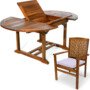 Stylish and solid, our 5-Piece Oval Extension Table Stacking Chair Set with Cushions is hand crafted from Indonesian Teak, with a java colored finish, and fitted with solid brass hardware. Solid mortise and tenon joinery coupled with highly skilled wood-steaming creates solid, snug fitting parts. The built In Hide-Away Butterfly Extension Leaf allows the table length to be set to either 48 or 72 inches. When extended the 1-7/8 inch umbrella hole is accessible, and is fitted with a brass grommet and cap. The lower pole catch increases umbrella pole stability. Natural oils and rubbers in Teak provide superior weather and insect resistance compared to other woods., Indonesian Teak with a Java Finish and Brass Fittings, Set Includes: 1x Teak Oval Extension Patio Table and 4x TD24 Teak Stacking Chairs and 4x TC20 Cushions, Built In Hide-Away Butterfly Extension Leaf, Table: 48 x 48 x 30 (expandable to 72-in), Chair: 24w x 23d x 37h