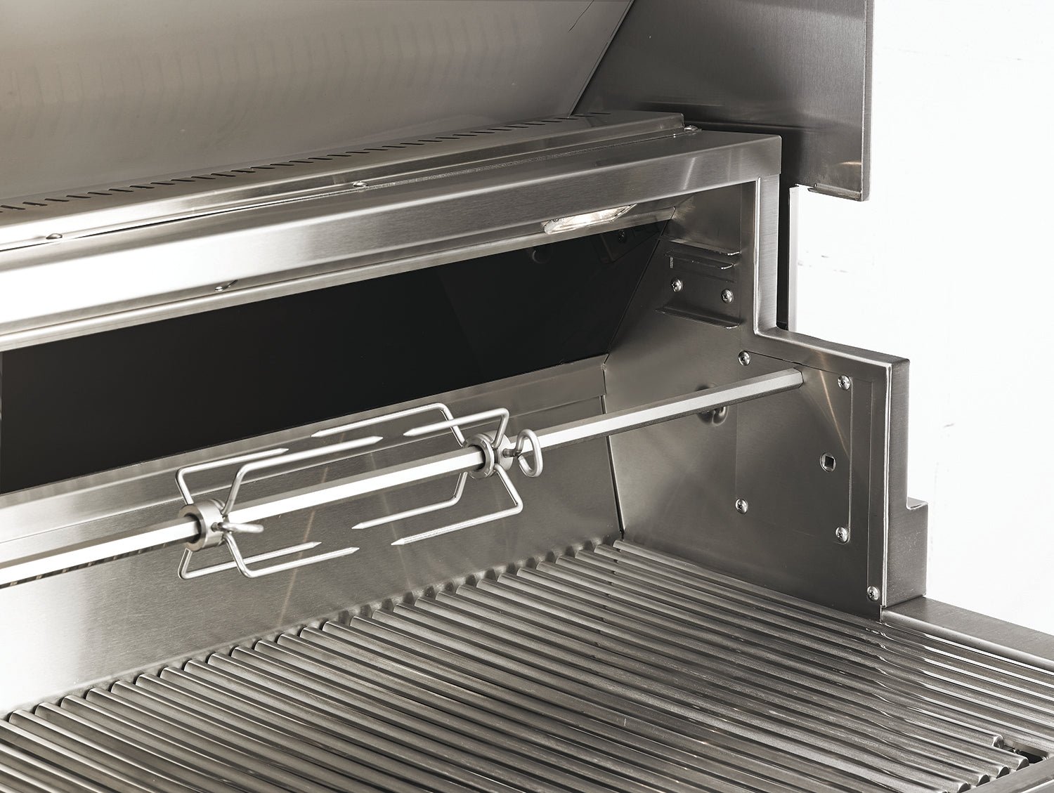 Concealed rotisserie motor with 100lb capacity, multi-position spit rod, and infrared burner. The spit rod is conveniently stored in a slide-out tray beneath the grill for easy access.